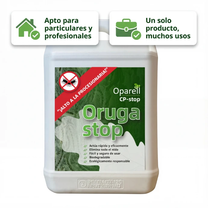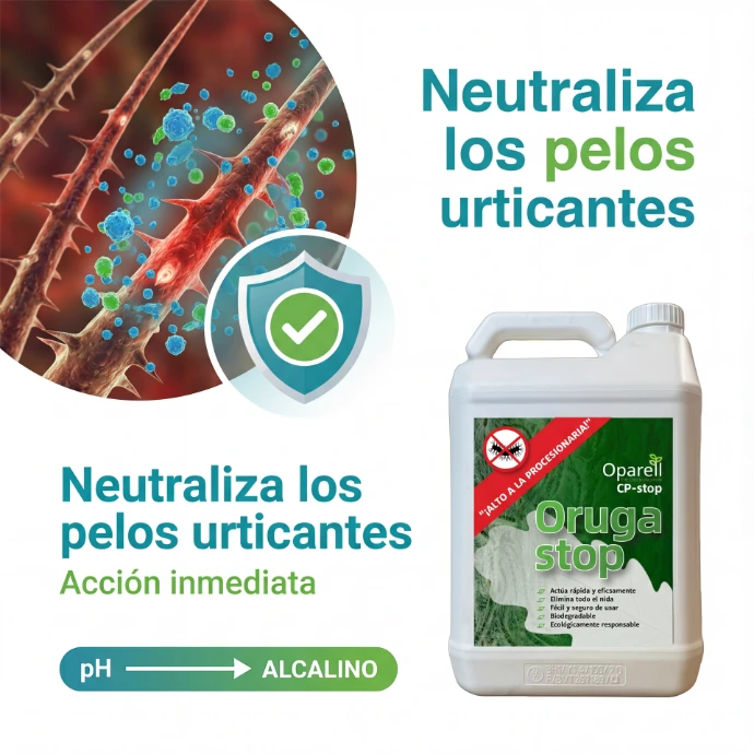 Pulveriza directamente sobre el nido: Oparell lo deshace y neutraliza los pelos urticantes al instante.